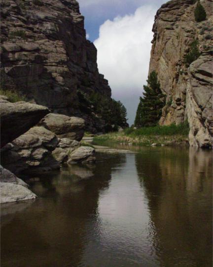As they approached the region where Casper Wyoming is located today, they crossed the North Platte more than once. One of those crossings was just North of Casper, where the Mormon Ferry was located. Webber states, �Pioneers easily walked across the river when shallow in late summer but earlier in the year with high water some kind of boating was far more safe. Mormons installed a toll ferry of two 30-foot long dugout canoes lashed together then added planks to make a bed onto which a yoke of oxen, still attached to a wagon, could be coaxed aboard then rowed across the river. This outfit was tied to a large rope that stretched across the river to keep the ferry from drifting downstream. The ferry operated between 1847 and 1851. It was a money-maker for the owners who charged anywhere from $3 to $5 per wagon to cross the river (34).� Today, there are dams up river at Seminoe and Alcova Wyoming that make the North Platte a small stream compared to the substantial river it was in 1851 (Stegner 306).