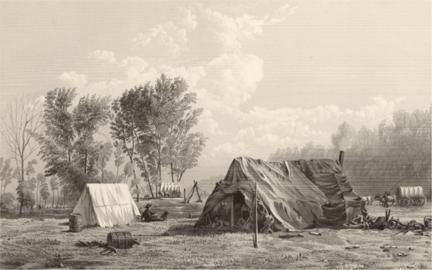 However the Shelleys arrived at Kanesville, they stayed there for the months of May and June. According to Brower, her group arrived in Kanesville the same season and ��were assigned, with others, to two log cabins, or rooms where we were to sleep, and to do our cooking at a fire-place, taking our turn with the bake kettle. We made our beds on the floor at night. It was here we learned to wait to be patient and take our turn, as there were so many of us to use that oven. We were a pretty good set of people and did not quarrel.�