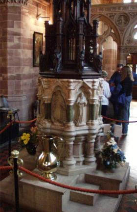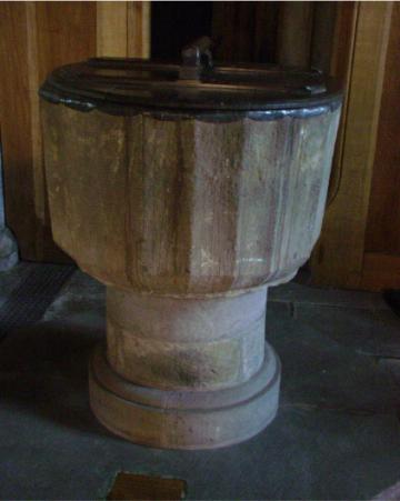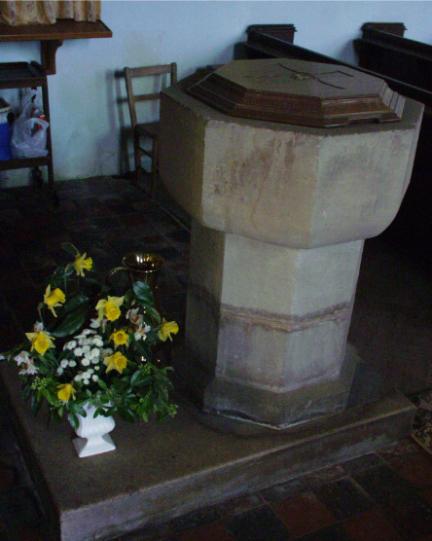 Church font. Francis Bray (3rd-great-grandfather) was christened at St. Milburga's Church in 1753.