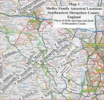 The villages that the Shelley family ancestors came from are located primarily in southeast Shropshire County. Shropshire is in west midland England. It is also known as Salop. It is a large county with a small population mostly in villages. The River Severn divides Shropshire equally into northeast and southwest halves. The meadows alongside the Severn are very fertile. The River separates the rolling acres of fertile agriculture lands in the north and east from the less fertile majestic hills of the south and west. The countryside has farms, herds of sheep, grazing cattle, cottages, grain fields and many trees (Pigots Directory of Shropshire, The Shropshire Village Book).